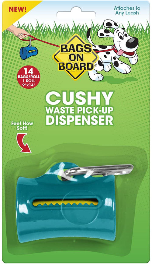 Bags on Board Cushy Dog Waste Bag Dispenser makes picking up after your dog easy and convenient. Lightweight and soft dog poop bag dispenser holds 14 large dog poop bags, and when it's time to refill, simply open the fastening flap and reload. The functional Cushy Dispenser attaches easily to leashes and harnesses in three ways, so you'll always have poop bag when you need it. Made with a soft, durable material that's lightweight and easy to clean. Includes 1 roll of 14 pet waste bags (9 in x 14 in). Available colors: Teal | Grey Bags on Board Cushy Dog Waste Bag Dispenser makes picking up after your dog easy and convenient.
