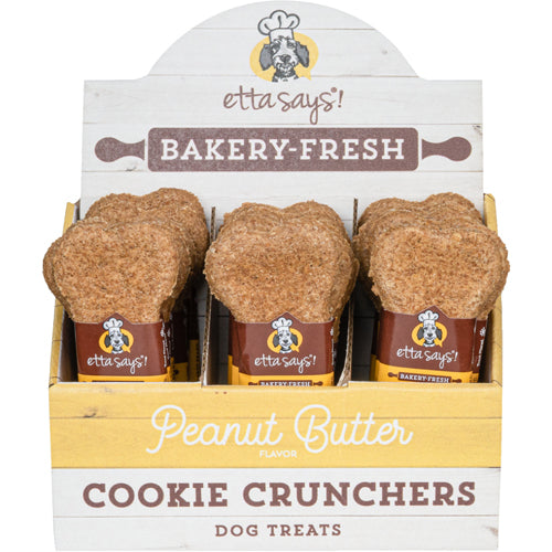 Etta Says! 5 Inch Peanut Butter Cookie Crunchers. Bakery-Fresh goodness with a satisfying crunch makes these Cookie Crunchers a delicious option for discerning pet parents. Designed in an attention-grabbing display box making them an attractive option for your counter, feature areas, and in-line.
