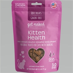 Get Naked Kitten Health treats are the perfect reward for your new furry bundle of joy. Formulated with DHA Omega-3, these scrumptious treats encourage healthy cognitive development during the crucial growth and development phase. Give your kitten a paw up in life with this yummy, chewable chicken treat.Chicken, sweet potatoes, vegetable glycerin, water, fish oil (source of DHA), sunflower oil (preserved with citric acid), natural chicken flavor, flaxseed, phosphoric acid (a preservative), citric acid (a preservative), herring oil (preserved with mixed tocopherols), brewers dried yeast, zinc proteinate, mixed tocopherols (a preservative), taurine.. Crude Protein Mini 18.0%|Crude Fat Mini 12.0%|Crude Fat Max 16.0%|Crude Fiber Max 2.0%|Moisture Max 18.0%|Calium Max 0.1%|Phosphorous Mini 0.45%|Sodium Max 0.60%|Magnesium Max 0.20%|Taurine Max 0.05%|Omega 3 Fatty Acids Mini 0.80%|Omega 6 Fatty Acids Mini 2.5%|Docosahexaenoic Acid (DHA) Mini 1.0|Calorie Content 3400 kcal ME/kg|2.7 kcal ME/treat"