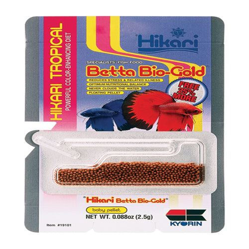 Hikari Betta Bio-Gold enhances the natural brilliant colors of your betta and will help prevent color fading. Its a completely balanced diet with vitamins added for healthy growth, including vitamin C which is important in reducing stress and fighting off disease. The floating pellets will never cloud the water and disperses evenly. Dispenser package allows you to control the amount of food you feed, helping to prevent overfeeding. All Hikari brand fish foods are manufactured by highly automated and specialized equipment using only high quality . Fish Meal, Wheat Flour, Soybean Meal, Rice Bran, Potato Starch, Krill Meal, Corn Gluten Meal, Wheat Germ Meal, Brewers Dried Yeast, Wheat Gluten Meal, Fish Oil, DL-Methionine, Spirulina, Garlic, Dried Seaweed Meal, Astaxanthin, Choline Chloride, Vitamin E Supplement, L-Ascorbyl-2-Polyphosphate (Stabilized Vitamin C), Inositol, D-Calcium Pantothenate, Riboflavin, Vitamin A Supplement, Thiamine Mononitrate, Pyridoxine Hydrochloride, Niacin, Folic Acid, Vitamin D3 Supplement, Biotin, Vitamin B12 Supplement, P-Aminobenzoic Acid, Disodium Phosphate, Salt, Ferrous Sulfate, Magnesium Sulfate, Zinc Sulfate, Manganese Sulfate, Copper Sulfate, Calcium Iodate, Red 3 (Artificial Color)."