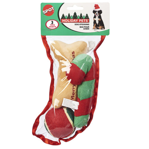 Holiday themed dog toys in a convenient festive stocking. 3 piece assortment.