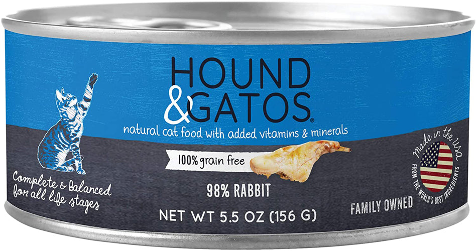 Hound & Gatos 98% Rabbit wet cat food is made in the USA with the worlds best ingredients. This tasty wet food has all of the essential vitamins and minerals your kitty needs, while leaving out the fillers and additives they dont.