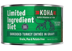 KOHA Limited Ingredient diet provides a safe and balanced meal for cats with sensitive stomachs. Each meal contains one meat with no added preservatives, GMOs, or fillers. KOHA?s Shredded Turkey recipe contains pumpkin to aid in healthy digestion. This cat food contains no grain, potato, wheat, corn, or soy. It is also free of carrageenan or guar gum. Made in USA. Hand-picked by the Pet Beastro to meet your cat?s nutritional needs!