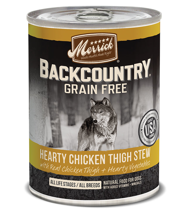 Merrick Backcountry Hearty Chicken Thigh Stew is packed with the things your dog loves to eat. This grain free stew has big pieces of real deboned meat, fresh-cut vegetables and a hearty gravy. Real chicken is always the first ingredient. This high quality protein helps build and maintain healthy muscle tissue and energy levels. Complete and balanced nutrition for adult dogs that adds moisture and flavor to your dog s diet. Merrick Backcountry canned stew recipes come in a variety of exotic protein blends. All Merrick recipes are crafted in their own five-star kitchen and cooked in the USA, in facilities that uphold the strict guidelines well defined by the FDA.