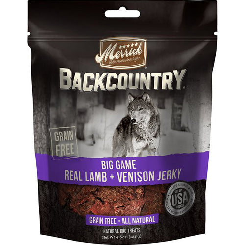 All-natural, high-protein treat features deboned lamb and venison as the first two ingredients. Poultry-free, limited ingredient recipe is packed with a meaty, wood-smoked flavor your best friend will love. Grain-free formula with no gluten ingredients for easier digestibility; also contains no artificial colors, flavors or preservatives. Makes a great positive reward training treat, and the ideal complement to a healthy, grain-free diet. Proudly crafted in Merrick’s Texas facility using the world’s best locally-sourced ingredients from farmers they know and trust. Merrick Backcountry Big Game Real Lamb & Venison Jerky Grain-Free Dog Treats feature a hearty, wood-smoked taste your four-legged friend will go wild for. These treats are grain-free with no gluten ingredients and start with real deboned lamb and venison as the first two ingredients. Specially formulated to mimic the ancestral canine diet, these savory, all-natural morsels are packed with the meaty protein your canine companion craves. And like all Merrick recipes, these treats are cooked right here in the USA!