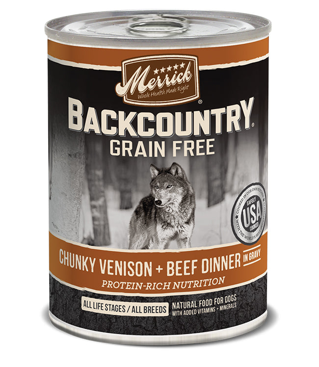 Merrick Backcountry Chunky Venison + Beef Dinner in Gravy is packed with the things your dog loves to eat. This grain free chunky stew has big pieces of real deboned meat, fresh-cut vegetables and a hearty gravy.