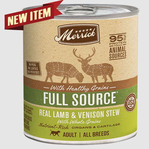 Merrick Full Source Canned Dog Food Real Lamb and Venison Stew with Healthy Grains delivers nose-to-tail nutrition that dogs need. Merrick utilizes more of the animal to craft nutritious, natural dog food packed with nutrients. Chunks of real lamb and venison are served in a thick gravy for a stew that dogs love. Plus, every serving has real, visible pieces of organ meat and cartilage for nose-to-tail eating. Organ meats are a concentrated source of vitamins, minerals, healthy fats and amino acids, while cartilage helps support a dog's healthy joints. And with 95% of protein from animal sources, this whole grain dog food also fuels healthy energy levels and helps develop muscle mass. Get tails wagging with an adult dog food that's always natural and made without any artificial preservatives, flavors or colors. This recipe is also crafted without any peas, lentils or potatoes. Like all Merrick recipes, this wet dog food was crafted in our Hereford, TX kitchen and cooked in the USA. - Merrick Full Source Canned Dog Food Real Lamb and Venison Stew with Healthy Grains - Wet food for dogs crafted with nutrient-rich organ meats and cartilage, plus whole grains - 95% of protein from animal sources - Wet food for dogs with no peas, lentils or potatoes - Organs provide a concentrated source of vitamins, minerals, healthy fats and amino acids - Chunks of real lamb and venison in a thick gravy help craft a delicious canned dog food stew - Like all Merrick recipes, this venison dog food with organs was crafted in our Hereford, TX kitchen and cooked in the USA