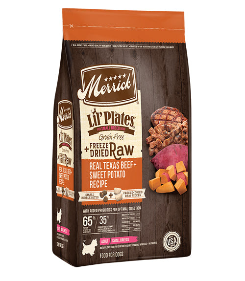 Merrick Lil? Plates Real Texas Beef + Sweet Potatoes with Raw Bites Recipe Dry Dog Food caters to the big appetites and nutritional needs of small pups. This grain free recipe features real, whole pieces of freeze-dried raw beef for enhanced nutritional benefits and fresh taste. Deboned meat is always the first ingredient. This high quality protein helps build and maintain healthy muscle tissue and energy levels. Freeze-dried pieces of real raw beef lock in great taste and provide nutritional benefits that are easily digestible. Features 60% of protein from animal sources. This corn, soy, wheat and gluten free meal includes probiotics and prebiotic fiber for healthy digestion, glucosamine and chondroitin for healthy joints plus flaxseed and omega 3 fatty acids to help support your dog?s healthy skin and coat. Real whole foods like sweet potatoes, potatoes, apples and blueberries add vitamins, minerals and antioxidants to this this high quality grain free diet. All Merrick recipes are crafted in our Hereford, TX kitchen and cooked in the USA, in facilities that uphold strict FDA guidelines.
