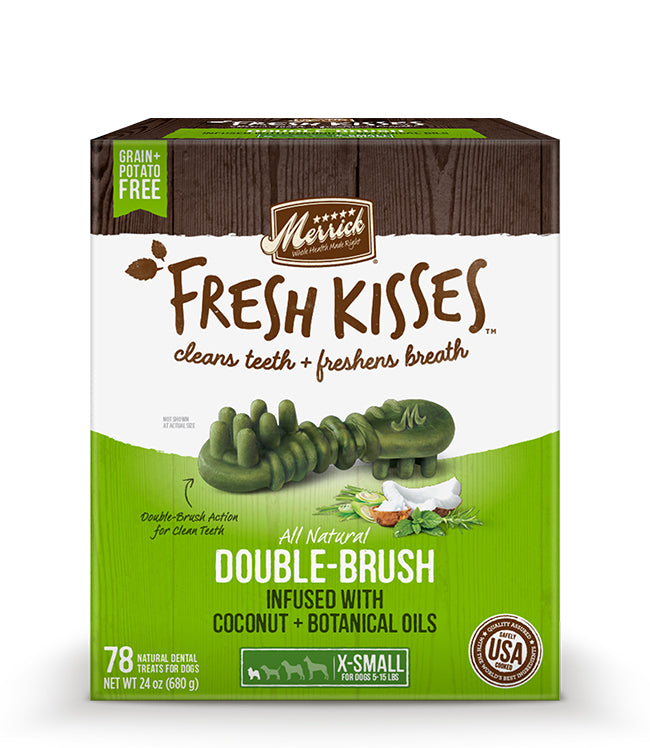 Merrick Fresh Kisses infused with Coconut + Botanical Oils are an innovative, natural dental treat designed not only to clean dogs teeth, but to truly freshen breath at the same time. Merrick Fresh Kisses feature a unique double-brush design that cleans teeth, and uses coconut + botanical oils to freshen breath. These treats are specially crafted to clean teeth. They are tough enough to ensure sufficient chew times, but soft enough to maintain contact with the dogs tooth to effectively clean teeth; Coconut oil and botanical oils (peppermint oil, lemongrass oil, and rosemary oil) freshen breath in an all-natural way; All-natural, grain-free and potato-free; Available in single packs, resealable pouches, and larger box or bulk options; All Merrick recipes are crafted in our Hereford, TX kitchen and cooked in the USA, in facilities that uphold strict FDA guidelinesPea Starch, Tapioca Starch, Vegetable Glycerin, Gelatin, Natural Flavor, Coconut Oil, Gum Arabic, Fruit Juice Color, Turmeric, Sunflower Oil, Peppermint Oil, Lemongrass Oil, Turmeric Oleoresin, Rosemary Oil. Crude protein (min.) 13.7%|Crude fat (min.) 3.0%|Crude fiber (max.) 1.7%|Moisture (max.) 13.0%|3300 kcal per kilogram or 30 kcal per piece ME (metabolizable energy) (calculated)."