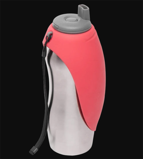 Our travel water bottle and bowl is easy to use and ideal for walks, hikes and road trips. Just fold up the wide silicone bowl and press the quick release button to let the water flow and quench your messy mutt?s thirst! Most of the unused water drains back into the stainless steel bottle after use and the bowl folds back over the bottle for easy transport.