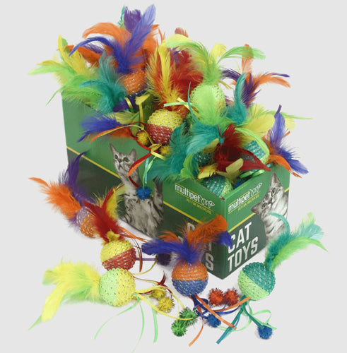 Mesh Ball cat toys are a glittery combination of mesh, feathers and ribbons that will attract cats and encourage play. They are lightweight making them easy to toss and bat. Cats will love the texture and natural feathers. This PDQ is available as a 30 piece.