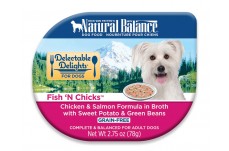 Natural Balance Delectable Delights Fish 'N Chicks Grain-Free Wet Dog Food lets your dog enjoy a highly palatable gourmet meal filled with delicious natural ingredients. This grain-free recipe is handcrafted with salmon and chicken and cooked to perfection in a savory broth with wholesome sweet potatoes and green beans. Fish `N Chicks gives your pup high-quality nutrition that can be served by itself or as a topper for a tasty dinner he won't be able to resist.