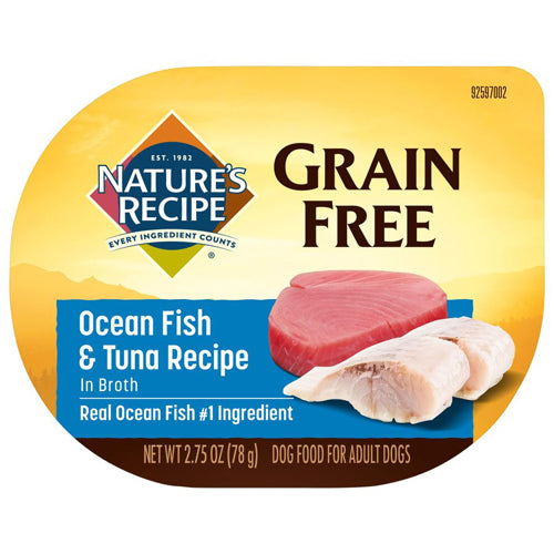 Nature's Recipe Grain Free Oceanfish & Tuna Recipe In Broth is premium dog food with real oceanfish as the #1 ingredient, and it has protein-rich tuna in a savory broth your dog will love. This grain free dog food is crafted for wholesome nutrition with high-quality ingredients including beta carotene-rich carrots to make a delectable meal. Your best friend will love the taste, you'll love feeding him healthy dog food that's supplemented with the essential vitamins and minerals he needs to thrive.