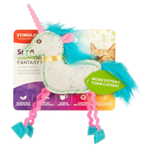 ",SmartyKat Fantasy Frenzy Crinkle Unicorn Cat Toy has dangling legs that entice cats to play with a felt body, feather main and tail this toy is a winner with cats. Contains Silvervine and catnip blend. Silvervine, a wild-growing herb foraged in the mountains of Japan and China, has a strong natural effect on cats, even some that don't respond to catnip. After extensive testing to find the perfect blend, Our proprietary blend was created as an ideal alternative for finicky felines who need a little extra excitement! HappyNip is more potent than catnip and as pure as can be!"