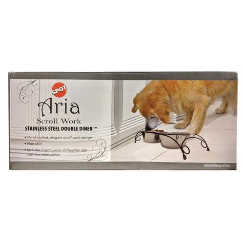 Spot Aria Double Diner Dog Bowl Scroll Work Silver 2 Quart