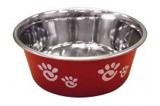 A great designer stainless bowl. Stainless Steel bowl with a colored plastic exterior. Paw print design. Non skid rubber ring on bottom prevents sliding.