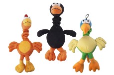 Plush toy with a bungee neck and soundchip that provides a realistic bird sound. Comes in an assortment of three different colored birds.