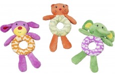Plush baby teething ring design with squeaker is perfect for small dogs/puppies. 3 character assortment.