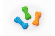 Stuffed latex 6 inch bone with a textured surface and squeaker. Three assorted colors.