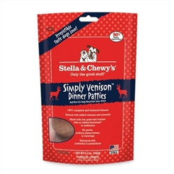 ngredients: Venison, Venison Kidney, Venison Lung, Venison Bone, Olive Oil, Pumpkin Seed, Potassium Chloride, Organic Cranberries, Organic Spinach, Organic Broccoli, Organic Beets, Sodium Phosphate Monobasic, Organic Carrots, Organic Squash, Organic Apples, Organic Blueberries, Choline Chloride, Dried Pediococcus Acidilactici Fermentation Product, Dried Lactobacillus Acidophilus Fermentation Product, Dried Bifidobacterium Longum Fermentation Product, Dried Enterococcus Faecium Fermentation Product, Taurine, Tocopherols (Preservative), Calcium Carbonate, Zinc Proteinate, Zinc Sulfate, Iron Sulfate, Iron Proteinate, Vitamin E Supplement, Niacin, Copper Sulfate, Copper Proteinate, Manganese Sulfate, Sodium Selenite, Manganese Proteinate, Thiamine Mononitrate, Pyridoxine Hydrochloride, Vitamin D3 Supplement, Calcium Iodate, Vitamin B12 Supplement. Guaranteed Analysis: crude protein min 45.0% crude fat min 30.0% crude fiber max 4.0% moisture max 5.0% Calorie Content: 4,755 kcal/kg (calculated); 65 kcal per small patty Formulated to meet the nutritional levels established by the AAFCO Dog Food Nutrient Profiles for All Life Stages. Feeding Guidelines: Serve as is or rehydrate by adding warm water. When feeding dry, always make sure your dog drinks fresh, clean water at mealtime. To rehydrate, crumble and add cup of water for every 2 patties. New Users: Mix Stella & Chewys with your current brand for the first 5-7 days. Clickhere for transitioning guidelines. Please note that these are guidelines. Always consult your veterinarian, especially for pregnant or nursing dogs. To protect yourself from bacteria that may be found in raw food, be sure to keep raw meat and poultry separate from other foods. Wash hands, working surfaces, bowls and utensils that come in contact with raw meat with soap and hot water. Available in: 6 oz. (approximately 12 small patties); 16 oz. (approximately 32 small patties)Venison, Venison Kidney, Venison Lung, Venison Bone, Olive Oil, Pumpkin Seed, Potassium Chloride, Organic Cranberries, Organic Spinach, Organic Broccoli, Organic Beets, Sodium Phosphate Monobasic, Organic Carrots, Organic Squash, Organic Apples, Organic Blueberries, Choline Chloride, Dried Pediococcus Acidilactici Fermentation Product, Dried Lactobacillus Acidophilus Fermentation Product, Dried Bifidobacterium Longum Fermentation Product, Dried Enterococcus Faecium Fermentation Product, Taurine, Tocopherols (Preservative), Calcium Carbonate, Zinc Proteinate, Zinc Sulfate, Iron Sulfate, Iron Proteinate, Vitamin E Supplement, Niacin, Copper Sulfate, Copper Proteinate, Manganese Sulfate, Sodium Selenite, Manganese Proteinate, Thiamine Mononitrate, Pyridoxine Hydrochloride, Vitamin D3 Supplement, Calcium Iodate, Vitamin B12 Supplement. Guaranteed Analysis crude protein min 45.0% crude fat min 30.0% crude fiber max 4.0% moisture max 5.0% Calorie Content 4,755 kcal/kg (calculated), 65 kcal per small patty Formulated to meet the nutritional levels established by the AAFCO Dog Food Nutrient Profiles for All Life Stages. Feeding Guidelines Serve as is or rehydrate by adding warm water. When feeding dry, always make sure your dog drinks fresh, clean water at mealtime. To rehydrate, crumble and add cup of water for every 2 patties. New Users Mix Stella & Chewys with your current brand for the first 5-7 days. Clickhere for transitioning guidelines. Please note that these are guidelines. Always consult your veterinarian, especially for pregnant or nursing dogs. To protect yourself from bacteria that may be found in raw food, be sure to keep raw meat and poultry separate from other foods. Wash hands, working surfaces, bowls and utensils that come in contact with raw meat with soap and hot water. Available in 6 oz. (approximately 12 small patties), 16 oz. (approximately 32 small patties)"