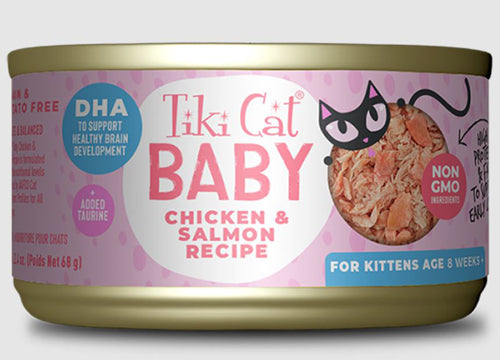 Kittens are born carnivores, but they also have very specific nutritional needs. With increasing energy, developing digestive and immune systems, and growing bodies, they need nutrition designed just for them. Tiki Cat Baby Chicken & Salmon Recipe gives kittens their best start, with high protein and fat to support early growth and DHA to promote healthy brain development, in a soft, flavorful formula.