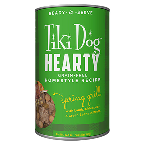 Made with natural, high-quality ingredients, Tiki Dog™ Hearty Spring Grill features tender lamb and chicken, with real chickpeas and green beans. No animal by-products, grains, corn, soy, white potatoes, artificial colors or flavors. It’s all the care and comfort of homemade in a convenient, ready-to-serve meal. Grain-freeHomestyle recipeNatural, high-quality ingredientsNon-GMO ingredients
