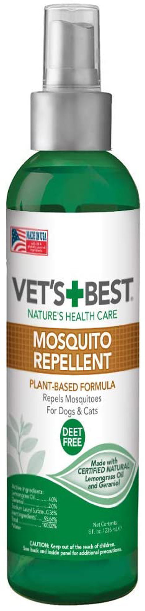 Vet's Best Mosquito Repellent Spray (8 oz) uses a unique blend of Lemongrass Oil and Geraniol Oil (from Citronella plants) to safely repel mosquitoes. Formula is deet free. Our formulas are independently tested and proven effective at repelling mosquitoes. Can be used directly on dogs and cats 12 weeks or older and people 2 years or older. For over 30 years, Vet?s Best has blended plant-based ingredients that work together to comfort and protect your pet. Our products are a plant-based alternative to traditional chemicals and can be used year-round. For added Mosquito protection, try Vet's Best Flea and Tick Yard & Kennel Spray that kills mosquitoes in outdoor spaces. Vet's Best Mosquito Repellent repels mosquitoes without the use of DEET.|Uses plant-based ingredients including certified natural essential oils like Lemongrass Oil and Geraniol (from Citronella plants).|Can be used on dogs and cats 12 weeks or older. Also great forthe whole family.|Can be reapplied every 2 hours as needed.