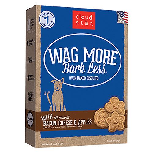 Cloud Star Wag More Bark Less uses only 7 all-natural ingredients in their Oven Baked with Bacon, Cheese & Apples Dog Treats to create the best-quality treats for your canine companion. Mouthwatering ingredients like cheddar cheese and bacon are gently mixed with wholesome apples and oats and slow-baked to perfection in fun, smiling star, sun and cloud shapes. They???re made for dogs of all sizes to crunch and enjoy, and they don???t contain any corn, soy or white potatoes. So go ahead and indulge your furry friend with a delicious, satisfying treat that???s only made with the good stuff.